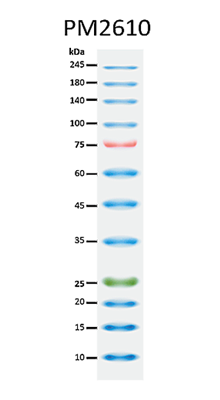 Under suggested conditions, the PM2610/PM2611 Enhanced 3-color High Range Protein Marker resolves 12 major bands in 15% SDS-PAGE (Tris-Glycine buffer) and after Western blotting to nitrocellulose membrane.